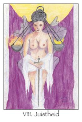 je op de schalen aan de kettingen van oorzaak en gevolg op uiterst gevoelig wijze je eigen handelen, ook wel karma genoemd. De kaart is direct verbonden met de Ster en moedigt aan om te leven vanuit het juiste beginsel van wijsheid: de universele